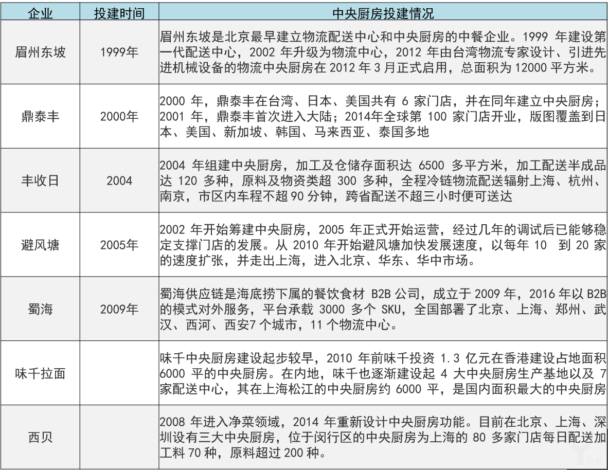 如海底捞、西贝、外婆家、避风塘、眉州东坡、鼎泰丰、丰收日,以及大娘水饺、真功夫、永和大王等知名连锁品牌,均有自己的中央厨房体系。普通连锁餐饮企业通常按未来3~5 年、现有产能的3~5倍进行中央厨房规划,但整体产能利用率都不到30%。