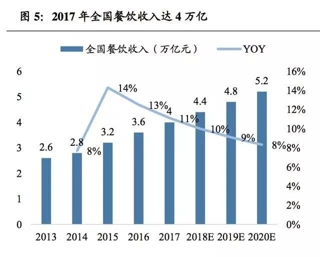 2017年,全国餐饮收入达4万亿,同比增长11%,服务网点达465.4万户,涉及门店超800万个,根据艾瑞咨询的数据,预计2020年我国餐饮收入将达5万亿。