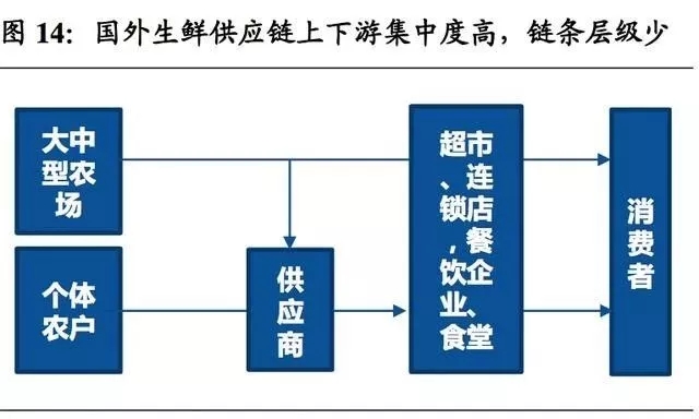 而国外生鲜供应链更简洁,供应商从大中型农场或个体农户直采后负责分拣、预处理直接交与终端客户。